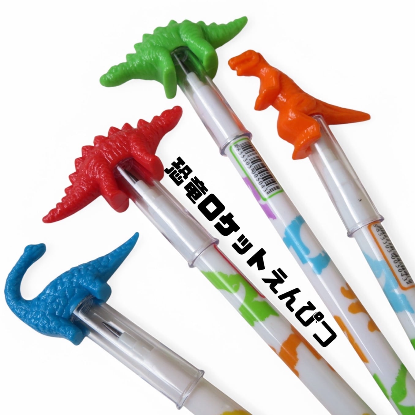 持ってるだけで楽しい気持ちになるカラーの恐竜ロケットえんぴつです。